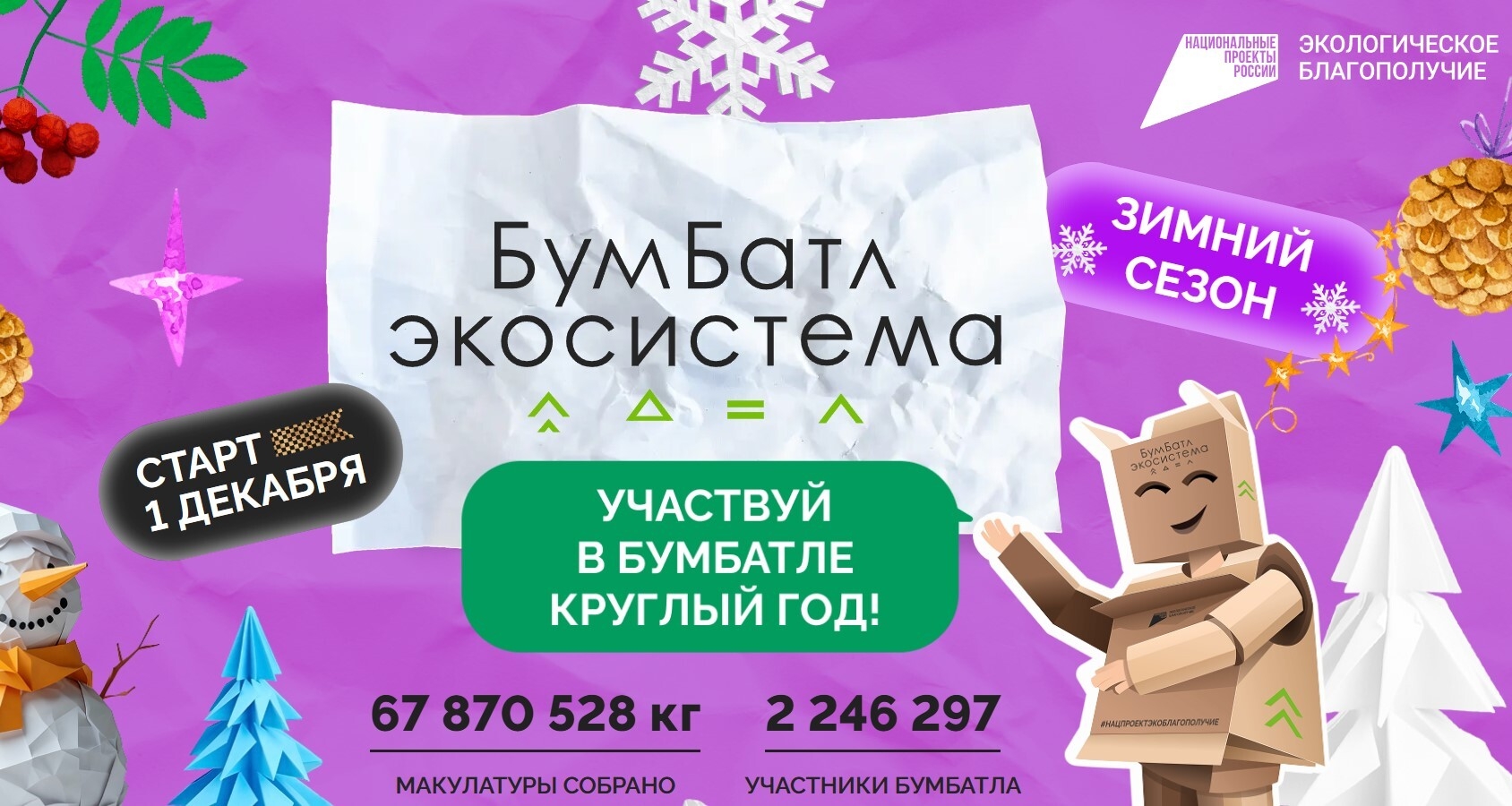 1 декабря стартовал зимний сезон Всероссийской акции «БумБатл», которая проходит в поддержку национального проекта «Экологическое благополучие» под эгидой Движения «Экосистема»