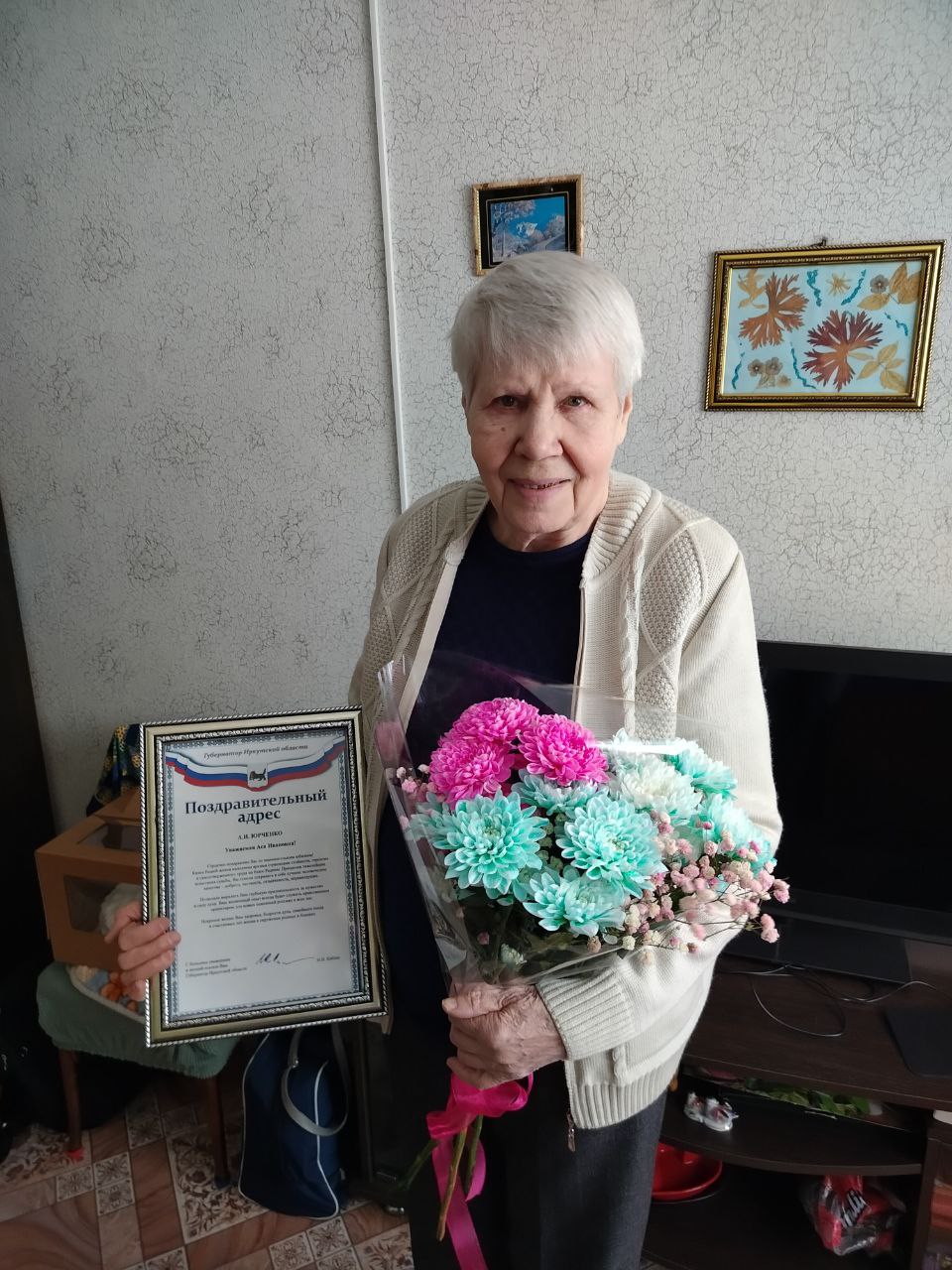 Поздравили с юбилеем Асю Ивановну заместитель директора Юлия Анатольевна Евдокимова и специалисты ОГБУ «Управление социальной защиты и социального обслуживания населения по Усть-Кутскому району», вручили поздравительный адрес от имени Губернатора Иркутской области И.И. Кобзева.