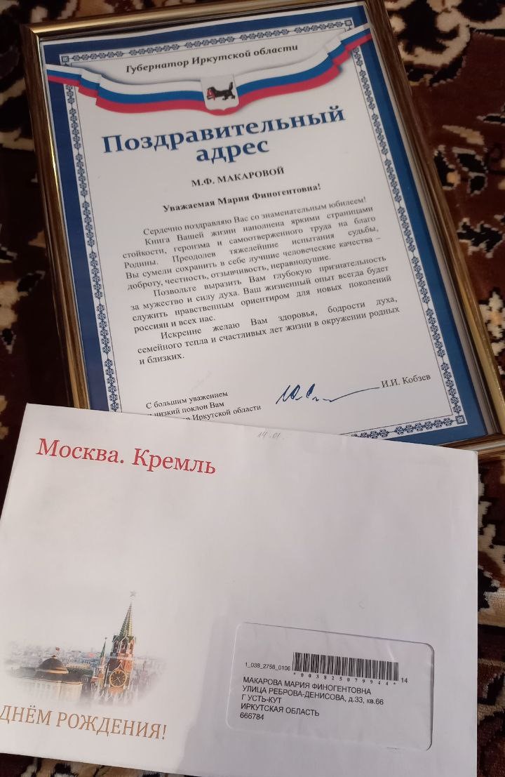 Сегодня Марию Финогентовну сердечно поздравили мэр Усть-Кутского района С.Г. Анисимов и директор Управления соцзащиты А.Ю. Кобзева, торжественно вручили именные поздравления от Президента России Владимира Путина, а также от Губернатора Иркутской области Игоря Кобзева, цветы, подарки. Для неё это было особенно важно и трогательно — знать, что про нее и её труд и жизненный путь ценят и помнят.
