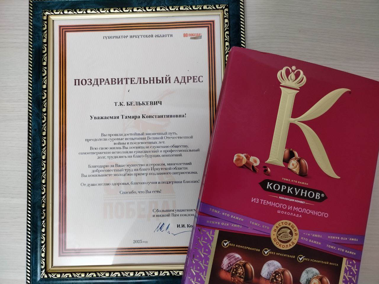 Доброй традицией стало вручение поздравительного адреса от Губернатора Иркутской области И.И. Кобзева. Поздравить, вручить поздравительный адрес, цветы и подарки пришли сегодня к Тамаре Константиновне и управление социальной защиты и совет ветеранов и коллеги с администрации УКМО, где Тамара Константиновна работала долгие годы.