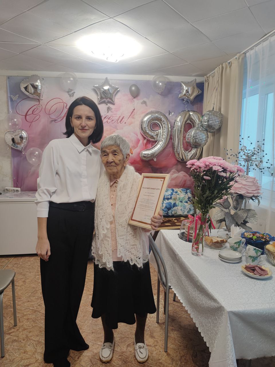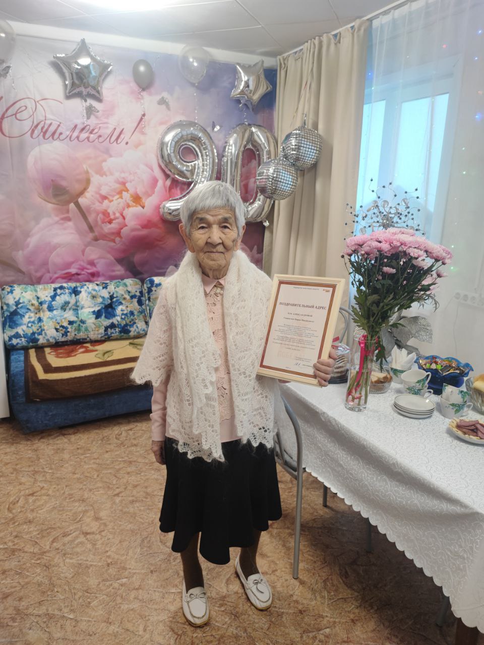 В такой прекрасный день спешим поздравить уважаемую Марию Михайловну с юбилеем, и передать традиционный поздравительный адрес от Губернатора Иркутской области И.И. Кобзева.