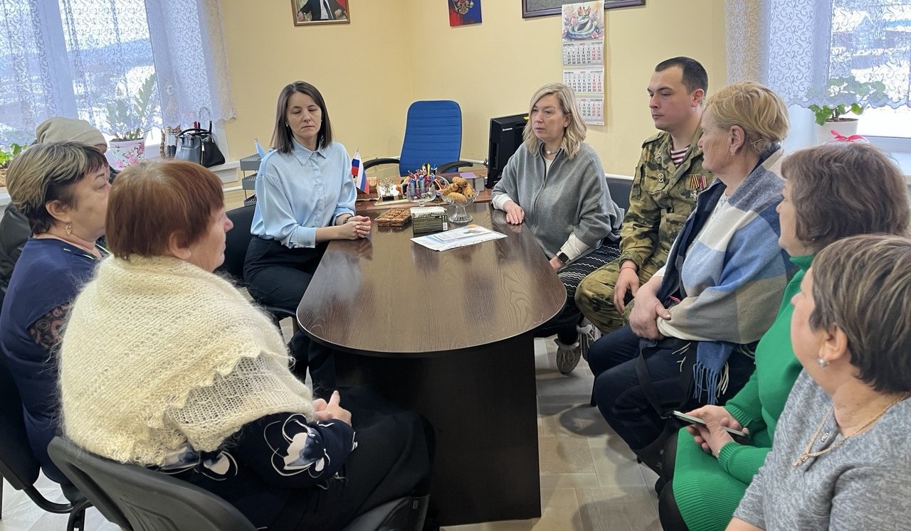Вторая часть встречи прошла в режиме круглого стола в Администрации поселка, куда были приглашены мамы, жены и близкие участников СВО.