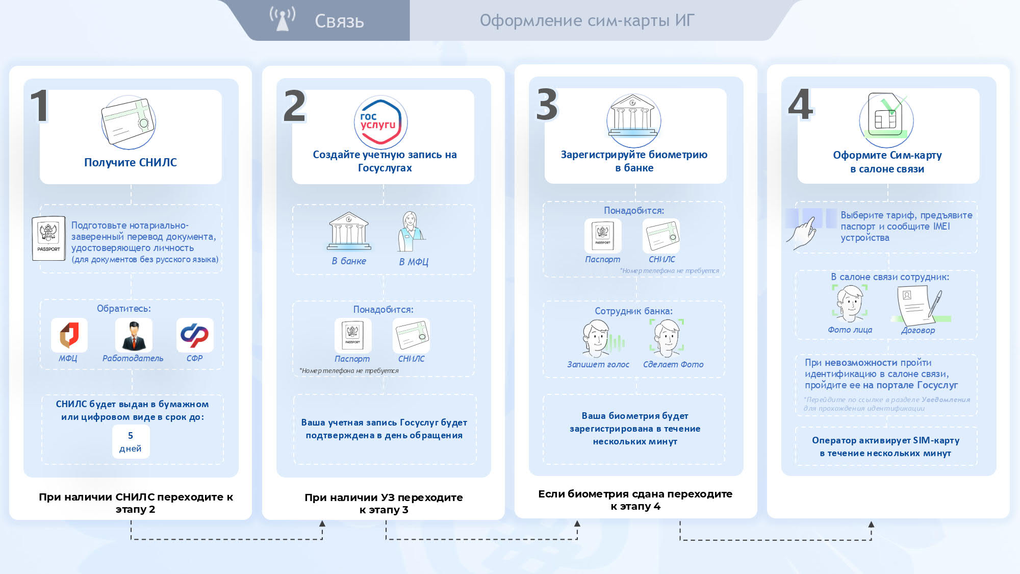 В целях информирования иностранных граждан и граждан Российской Федерации о новых требованиях по обороту sim-карт российских операторов связи, установленных Федеральным законом от 8 августа 2024 года № 303-ФЗ, просим ознакомиться с памяткой по оформлению sim-карт иностранными гражданами.