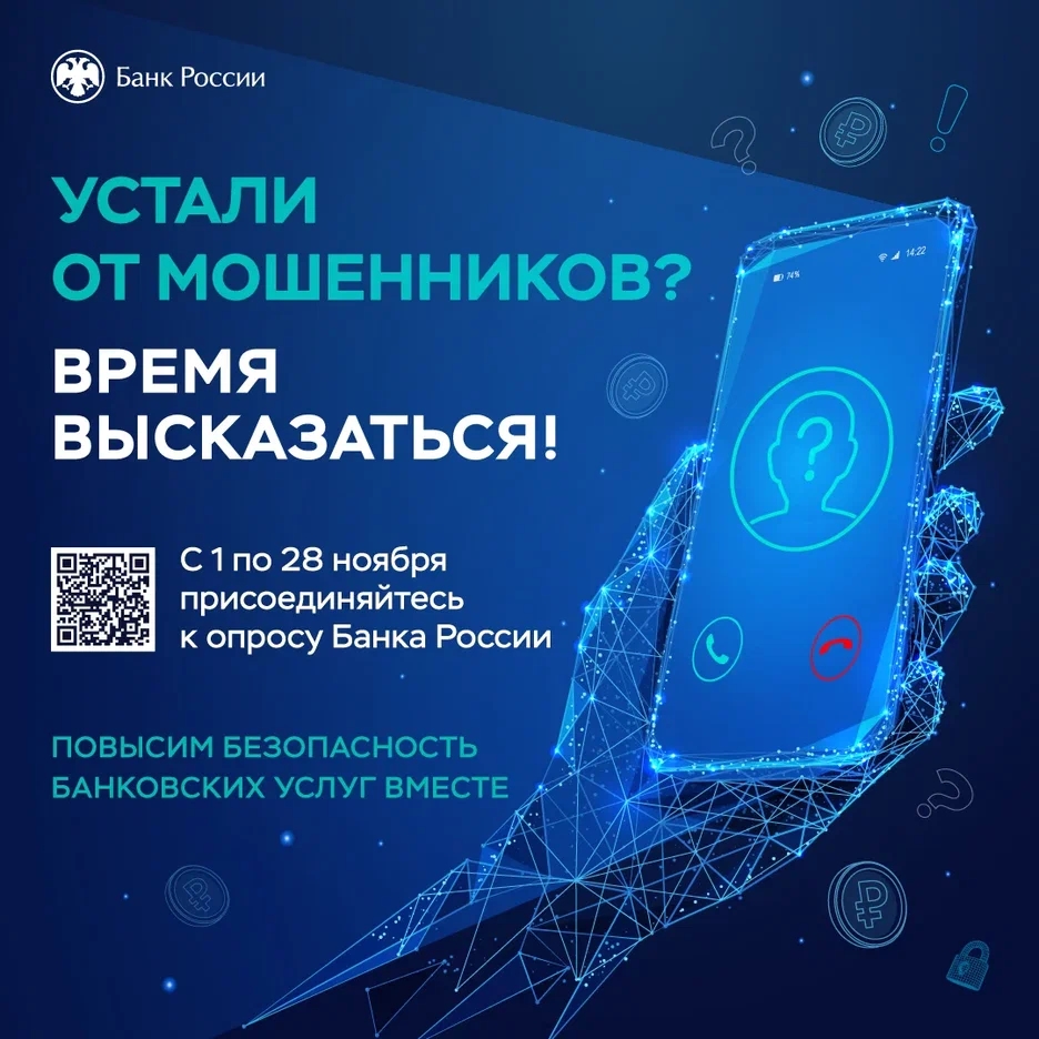 Приглашаем принять участие в анонимном опросе о безопасности банковских услуг по ссылке www.cbr.ru/informatio... . Его результаты Банк России учтет в мероприятиях по обеспечению информационной безопасности финансовых организаций.