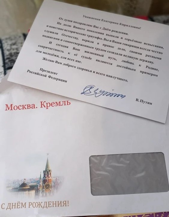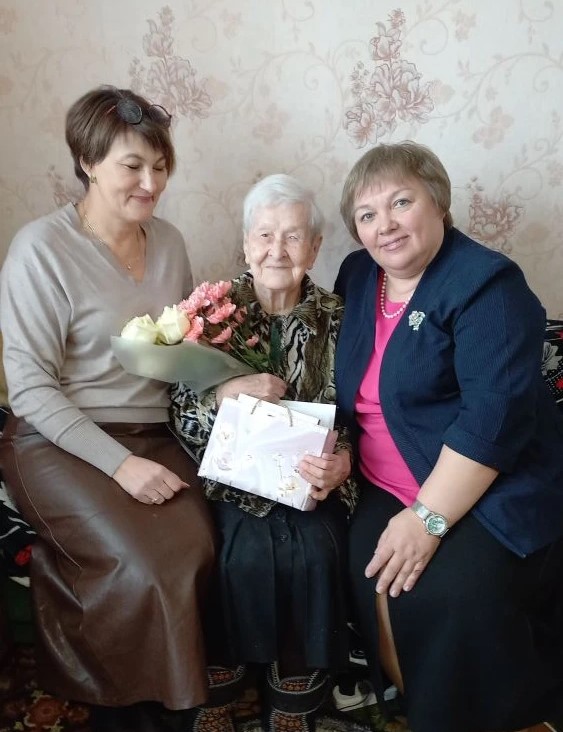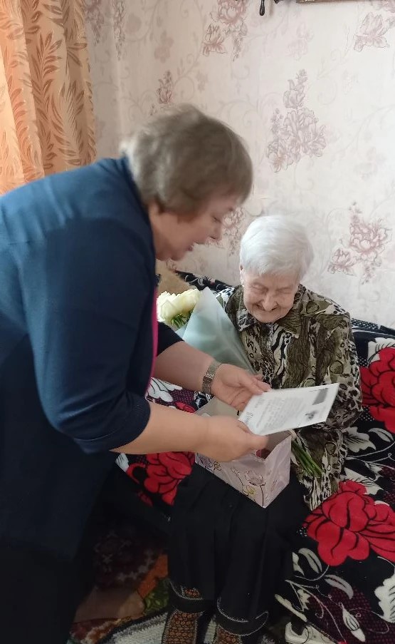 Сегодня директор Управления социальной защиты А.Ю. Кобзева и заместитель мэра УКМО Е.А. Кузнецова начали рабочий день с приятного, приехали с поздравительным адресом от Президента РФ В.В. Путина и подарками поздравить Екатерину Кирилловну, которая уже нас очень ждала, нарядилась, накрыла стол. Несмотря на возраст, Екатерина Кирилловна все еще самостоятельно хозяйничает дома, поддерживает домашний уют и чистоту. Екатерина Кирилловна живет одна, близких родственников нет и поэтому к ней приходит помогать социальный работник.