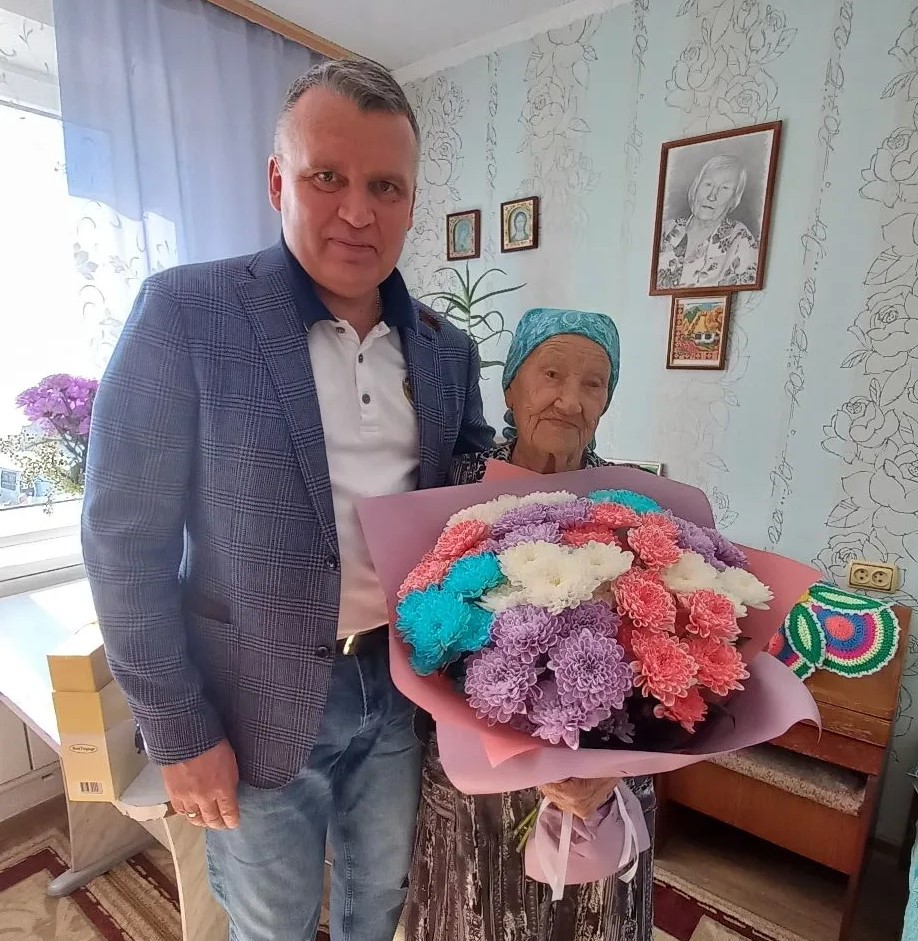 Сегодня в день рождения Марию Васильевну пришли поздравить А.Ю. Кобзева, директор Управления социальной защиты, и С.Г. Анисимов, мэр Усть-Кутского муниципального образования. Марии Васильевне с удовольствием вручили поздравительный адрес от Президента РФ В.В. Путина, цветы, подарки.
